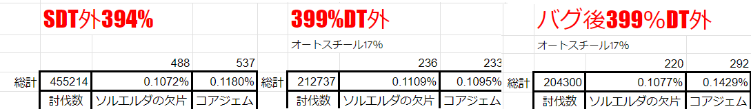 装備のアイテムドロップ200%、ドロファミ100%、ユニオン幸運50%、財物20%、PHS24%、インナードロップ5%の394%または399%で計測